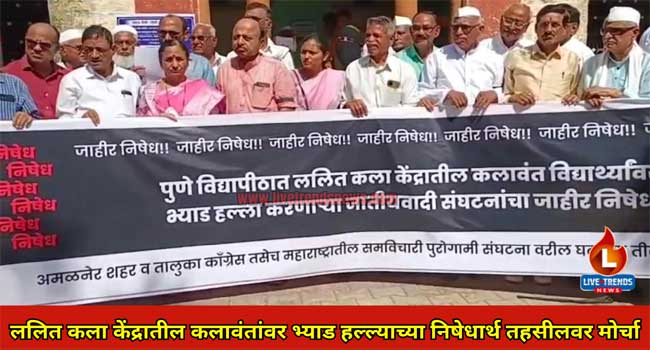अमळनेर-लाईव्ह ट्रेंडस न्यूज प्रतिनिधी । पुणे विद्यापीठातील ललित कला केंद्रात नाटकाचा प्रयोग सुरू असताना काही समाजकंटकांकडून कलावंत विद्यार्थ्यांवर भ्याड हल्ला करण्यात आला होता. या हल्ल्याच्या निषेधार्थ मंगळवारी ६ फेब्रुवारी रोजी दुपारी १ वाजता अमळनेर शहर व तालुका काँग्रेसच्या वतीने अमळनेर तहसील कार्यालयावर मोर्चा काढण्यात आला व विविध मागण्याचे निवेदन देण्यात आले.