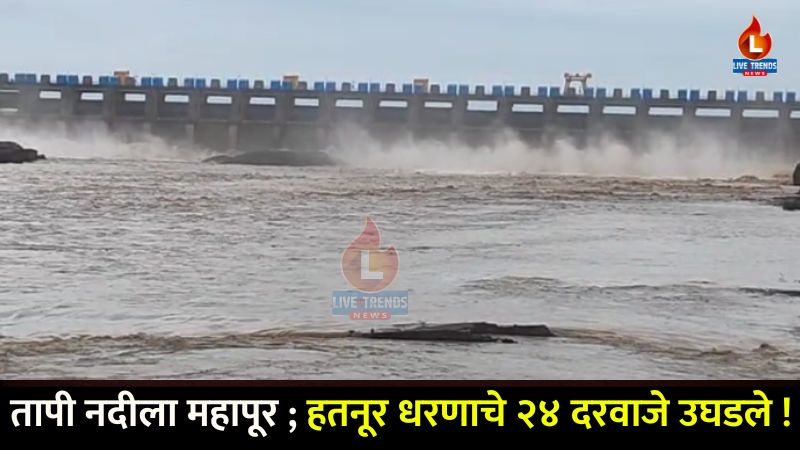 भुसावळ-लाईव्ह ट्रेंडस न्यूज प्रतिनिधी । जळगाव जिल्ह्यातील हतनूर धरणाचे आज २४ दरवाजे उघडण्यात आले आहेत, ज्यामुळे तापी नदीला मोठ्या प्रमाणावर पूर आला आहे. धरणाच्या १६ दरवाजांमधून पूर्ण क्षमतेने, तर उर्वरित ८ दरवाजांमधून १ मीटरने पाण्याचा विसर्ग सुरू आहे. सद्यस्थितीत धरणातून तब्बल १ लाख २५ हजार क्युसेक इतका प्रचंड पाण्याचा विसर्ग तापी नदीपात्रात सोडण्यात येत आहे. यामुळे नदीकाठच्या गावांमध्ये पूरस्थिती निर्माण होण्याची शक्यता असल्याने प्रशासनाने नागरिकांना सतर्कतेचा इशारा दिला आहे.
