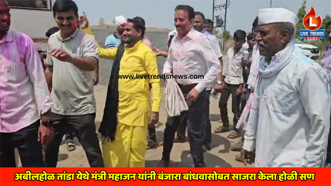 जामनेर-लाईव्ह ट्रेंडस न्यूज प्रतिनिधी | होळीचा सणाला बंजारा समाजामध्ये विशेष महत्त्व असून यामुळे बंजारा समाजाची होळी ही एक आगळ्यावेगळ्या प्रकारे साजरी केली जाते या बंजारा समाजाच्या होळीमध्ये सामील होण्यासाठी राज्याचे ग्राम विकास तथा पर्यटन मंत्री गिरीश महाजन यांनी जामनेर तालुक्यातील अंबिलहोळ तांडा येथे बंजारा समाजासोबत पारंपारिक रित्या मोठ्या उत्साहात होळी साजरी केली. यावेळी त्यांनी बंजारा महिलांचे होळी नृत्य पाहिले, त्याचबरोबर बंजारा पुरुषासोबत नृत्य करून बंजारा समाजाच्या होळी सहभागी झाले होते. यावेळी त्यांनी बंजारा बांधवांसोबत रंगाची होळी खेळली त्याचबरोबर बंजारा बांधवांच्या होळीचे विशेष महत्त्व मंत्री महाजन यांना सांगण्यात आले. त्याचबरोबर गीताच्या माध्यमातून महिला व पुरुषांनी ग्रामविकास मंत्री यांचे स्वागतही केले व यावेळी राम मंदिर मोदींनी बांधले तो सण कसा साजरा झाला हे गीत बंजारा भाषेत सादर करण्यात आले.
