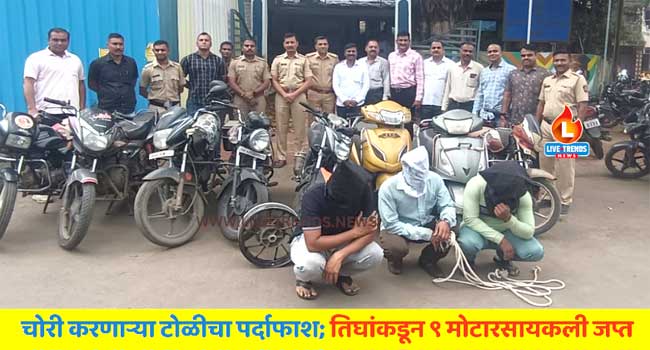 भुसावळ बाजार पेठ पोलीस ठाण्याच्या हद्दीत दुचाकी चोरीचे अनेक गुन्हे दाखल करण्यात आले आहे. या गुन्ह्यातील संशयितांचा शोध घेण्याचे आदेश जिल्हा पोलीस अधिक्षक एम.राजकुमार यांनी दिले होते. या अनुषंगाने अपर पोलीस अधिक्षक चंद्रकांत गवळी, उपविभागाीय पोलीस अधिकारी कृष्णात पिंगळे यांच्या मार्गदर्शनाखाली पोलीस निरीक्षक बबन आव्हाण यांच्या सुचनेनुसार पथकाने कारवाई केली. यात संशयित आरोपी मोईद शेख अजीज (वय-२५) रा. खडका रोड, भुसावळ, शेख रेहान शेख रशिद वय २८ रा. आयान कॉलनी भुसावळ आणि सैय्यद अक्रम सैय्यद हातम वय २३ रा. माटरागाव ता.शेगाव जि.बुलढाणा यांना तिघांना अटक केली . त्यांच्याकडून चोरीच्या ९ मोटारसायकली जप्त करण्यात आले आहे.
