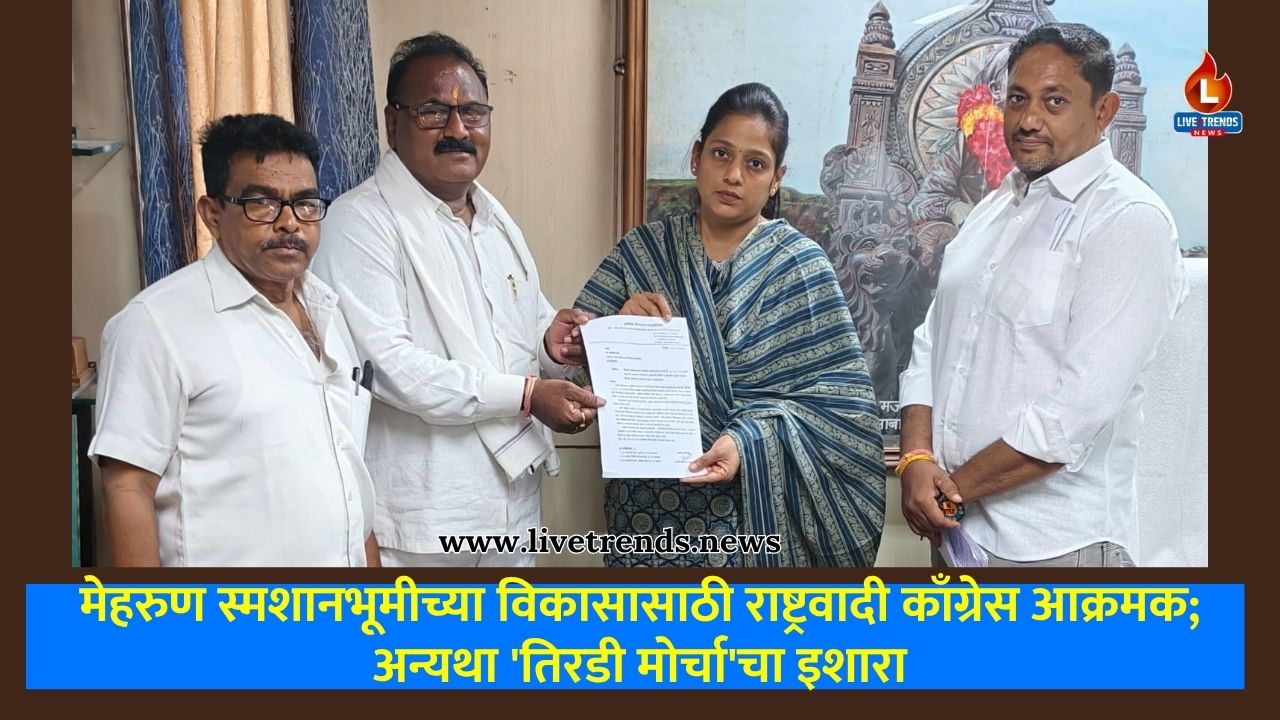 जळगाव-लाईव्ह ट्रेंडस न्यूज प्रतिनिधी |  मेहरुण परिसरातील स्मशानभूमीच्या दुरवस्थेचा प्रश्न आता चांगलाच तापला असून, राष्ट्रवादी काँग्रेस पार्टी (शरदचंद्र पवार पक्ष) या प्रश्नावर आक्रमक झाली आहे. वारंवार मागणी करूनही प्रशासनाकडून दुर्लक्ष होत असल्याने, माजी महानगराध्यक्ष अशोक सीताराम लाडवंजारी यांनी महापौर दीपमाला काळे यांना गुरुवारी, १६ एप्रिल रोजी निवेदनाद्वारे थेट ‘तिरडी आंदोलना’चा इशारा दिला आहे. याप्रसंगी सुनिल माळी, किरण राजपूत आदी उपस्थित होते.