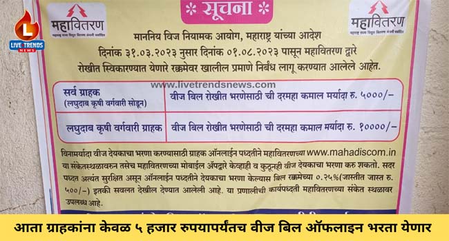 विज बिल भरण्याकरिता आजही शहरी व ग्रामीण भागात रांगेमध्ये उभे राहून वीज ग्राहक आपला बिलाचा भरणा करतात. त्याला आता ऑनलाइन भरण्याकरिता महावितरण पावले उचलत .लघुदाब कृषी वर्ग सोडून यांना दरमहा कमाल मर्यादा किंवा पाच हजार रुपया पर्यंतचे वीज बिल भरता येणार आहे. तसेच लघुदाब कृषी वर्गातील ग्राहकांना विज बिल रोखित भरण्यासाठी ची दरमहा कमाल मर्यादा १० हजार रुपये एवढी राहणार आहे.