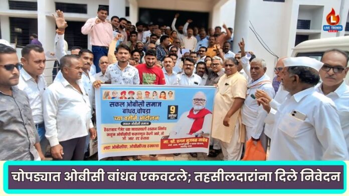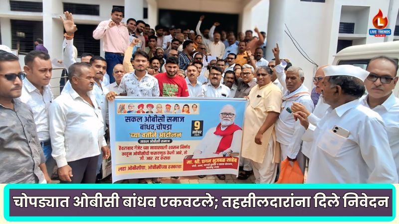 चोपडा-लाईव्ह ट्रेंडस न्यूज प्रतिनिधी । ओबीसी समाजाच्या आरक्षणात होणाऱ्या कथित ‘बोगस’ घुसखोरीच्या विरोधात चोपडा तालुक्यातील सकल ओबीसी समाजाने आक्रमक भूमिका घेतली आहे. हैदराबाद गॅझेटिअरबाबत सरकारने काढलेला शासन निर्णय (जीआर) तात्काळ रद्द करावा, अशी मागणी करत ओबीसी बांधवांनी आज तहसीलदार भाऊसाहेब थोरात यांना निवेदन दिले. या निवेदनात ओबीसी समाजावर होत असलेल्या अन्यायावर प्रकाश टाकण्यात आला.