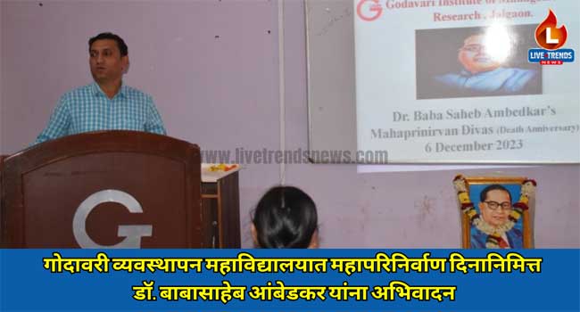 जळगाव-लाईव्ह ट्रेंडस न्यूज प्रतिनिधी । गोदावरी फाउंडेशन संचलित गोदावरी इन्स्टिट्युट ऑफ मॅनेजमेंट अँड रिसर्च जळगाव व डॉ वर्षा पाटील वुमेन्स कॉलेज ऑफ कॉम्प्युटर ॲप्लिकेशन महाविद्यालयात महापरिनिर्वाण दिनानिमित्त डॉ.बाबासाहेब आंबेडकर यांना अभिवादन करण्यात आले.