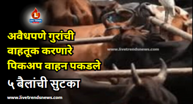 मुक्ताईनगर-लाईव्ह ट्रेंडस न्यूज प्रतिनिधी । मुक्ताईनगर तालुक्यातील पूर्णाड फाट्याजवळ अवैधपणे गुरांची वाहतूक करणारे पिकअप वाहन मुक्ताईनगर पोलिसांनी पकडले आहे. यामध्ये ५ बैलांची वाहतूक होत असल्याचे निष्पन्न झाले असून त्यांची सुटका करण्यात आली आहे. याप्रकरणी मुक्ताईनगर पोलीस ठाण्यात एकावर गुन्हा दाखल करण्यात आला.