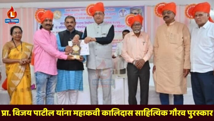 यावल-लाईव्ह ट्रेंड्स न्यूज प्रतिनिधी । कल्याण येथे वास्तव्य करणारे बहुपेडी प्रतिभेचे अधिष्ठान प्रा. विजय पाटील यांना “महाकवी कालिदास साहित्यिक गौरव पुरस्कार २०२५” ने सन्मानित करण्यात आले आहे. साहित्य, काव्य, अभिनय आणि गायन अशा अनेक क्षेत्रांत उल्लेखनीय योगदान दिल्याबद्दल त्यांना नाशिक येथे झालेल्या रिमझिम काव्य संमेलनात गौरविण्यात आले.