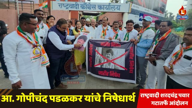 जळगाव-लाईव्ह ट्रेंडस न्यूज प्रतिनिधी । राष्ट्रवादी काँग्रेस पक्षाचे (शरदचंद्र पवार गट) ज्येष्ठ नेते जयंत पाटील यांच्याबद्दल भाजपा आमदार गोपीचंद पडळकर यांनी केलेल्या बेताल वक्तव्यामुळे राष्ट्रवादी काँग्रेसच्या कार्यकर्त्यांमध्ये तीव्र संताप व्यक्त होत आहे. यांचे निषेधार्थ आज जळगाव शहरातील आकाशवाणी चौकातील कार्यालयासमोर राष्ट्रवादी शरदचंद्र पवार गटातर्फे जोरदार आंदोलन करण्यात आले. यावेळी कार्यकर्त्यांनी गोपीचंद पडळकर यांच्या फोटोला चपला मारून व काळी शाई फासून निषेध नोंदवला.