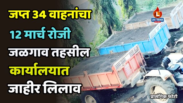 जळगाव-लाईव्ह ट्रेंड्स न्यूज प्रतिनिधी । जळगाव तालुक्यात अवैध गौण खनिज म्हणजेच वाळू वाहतुकीवर नियंत्रण ठेवण्यासाठी प्रशासनाने कारवाईचा वेग वाढवला असून अशा कारवाईदरम्यान जप्त करण्यात आलेल्या वाहनांबाबत मोठा निर्णय घेण्यात आला आहे. शासकीय दंडाची रक्कम न भरलेल्या वाहनमालकांवरील कारवाईचा भाग म्हणून प्रशासनाने जप्त 34 वाहनांचा जाहीर लिलाव करण्याचा निर्णय घेतला असून हा लिलाव 12 मार्च 2026 रोजी तहसील कार्यालयात आयोजित करण्यात येणार आहे.