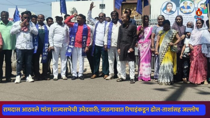 महाराष्ट्रातून राज्यसभेसाठी निवडून जाणाऱ्या चार जागांपैकी भारतीय जनता पक्षाने आंबेडकरी चळवळीतील प्रमुख चेहरा म्हणून ओळख असलेल्या रामदास आठवले यांना तिसऱ्यांदा संधी दिल्यामुळे कार्यकर्त्यांमध्ये विशेष उत्साहाचे वातावरण निर्माण झाले आहे. या पार्श्वभूमीवर जळगाव शहरात रिपब्लिकन पार्टी ऑफ इंडिया (आठवले)च्या वतीने रेल्वे स्टेशन परिसरात विशेष कार्यक्रम आयोजित करण्यात आला.