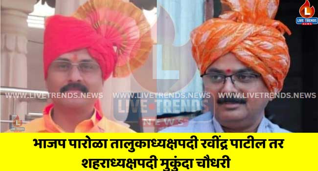 यात भारतीय जनता पार्टी पारोळा तालुकाध्यक्षपदी रविद्र भोमा पाटील यांची तर पारोळा शहरध्यक्षपदी मुकुंदा भिका चौधरी यांची निवड करण्यात आली आहे. पारोळा तालुक्यातील भाजपाचे आजी-माजी पदाधिकार्यांकडून व माजी खासदार जळगाव जिल्ह्याचे ए. टी. नाना पाटील, माजी नगराध्यक्ष सुरेंद्र बोहरा, माजी नगराध्यक्ष गोविंद शिरोळे, माजी तालुकाध्यक्ष अतुल मोरे आदींसह इतरांनी या दोन्ही मान्यवरांचे अभिनंदन केले आहे.