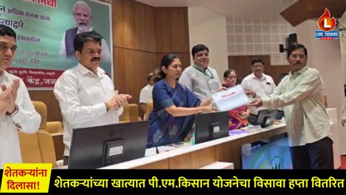 जळगाव-लाईव्ह ट्रेंडस न्यूज प्रतिनिधी । पंतप्रधान किसान सन्मान निधी (पी.एम.किसान) योजनेअंतर्गत शेतकऱ्यांच्या खात्यात विसाव्या हप्त्याचे वितरण करण्यात आले आहे. पंतप्रधान नरेंद्र मोदी यांनी वाराणसी येथून ऑनलाईन पद्धतीने या निधीचे वितरण केले. या अनुषंगाने, शनिवारी, २ ऑगस्ट रोजी दुपारी १२ वाजता जळगाव जिल्हाधिकारी कार्यालयातील नियोजन भवनात कृषी विभाग, जळगावच्या वतीने एका विशेष कार्यक्रमाचे आयोजन करण्यात आले होते. या कार्यक्रमाला केंद्रीय मंत्री रक्षाताई खडसे यांची प्रमुख उपस्थिती होती.