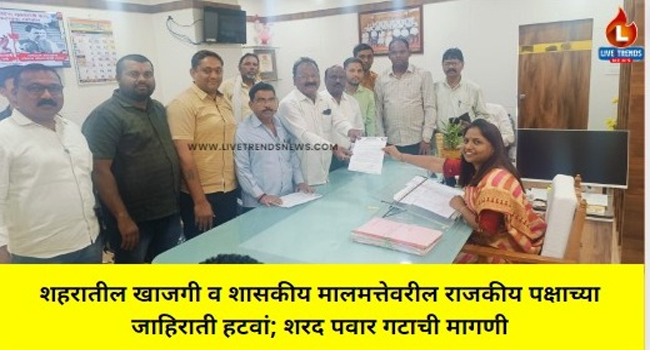 जळगाव-लाईव्ह ट्रेंडस न्यूज प्रतिनिधी | शहरातील खाजगी व शासकीय मालमत्तेवरील विना परवानगी काही राजकीय पक्षाचे झेंडे, बॅनर, जहिराती लावलेले आहे. या जाहिराती लावणाऱ्या पदाधिकाऱ्यांवर कायदेशीर कारवाई करावी अशा मागणीचे निवेदन राष्ट्रवादी शरद पवार गटाच्या कार्यकर्त्यांनी महानगरपालिका आयुक्त विदया गायकवाड यांना दिले. भारतीय जनता पार्टी या राजकीय पक्षाच्या झेंडे व बॅनर यांच्या स्वरूपात लागलेल्या जाहिराती शहरातील खाजगी व शासकीय मालमत्तेवर लागलेल्या आहे.