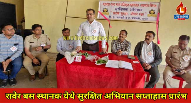 रावेर-लाईव्ह ट्रेंडस न्यूज प्रतिनिधी  | महाराष्ट्र राज्य मार्ग परिवहन महामंडळ जळगाव विभागांतर्गत रावेर बस स्थानकात सुरक्षित अभियान सप्ताहास प्रारंभ करण्यात आला आहे.रावेर तहसीलदार बंडू कापसे‌ यांच्या हस्ते या अभियानाचा शुभारंभ करण्यात आला. कार्यक्रमाचे अध्यक्षस्थानी आगार व्यवस्थापक विजय पाटील होते. तर प्रमुख पाहुणे म्हणून जेष्ठ पत्रकार दीपक नगरे, विभागीय लेखाधिकारी  मिलींद सांगळे, स्थानक प्रमुख संदिप तायडे, वाहतुक निरिक्षक जयेश लोहार,वाहतुक नियंत्रक एस. के. शेख  हे उपस्थित होते.