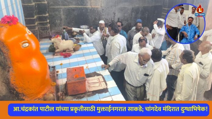 आ. चंद्रकांत पाटील यांच्या उत्तम आरोग्यासाठी आणि दीर्घायुष्यासाठी शुक्रवारी ६ मार्च रोजी सकाळी चांगदेव गावातील ऐतिहासिक श्री योगेश्वर चांगदेव महाराज मंदिरात विशेष धार्मिक विधींचे आयोजन करण्यात आले होते. यावेळी गावचे शिवसैनिक, युवा सैनिक, ज्येष्ठ नागरिक आणि समस्त ग्रामस्थांनी एकत्र येत चांगदेव महाराजांना दुग्ध अभिषेक घातला. त्यानंतर भक्तीपूर्ण वातावरणात महापूजा आणि आरती करण्यात आली.