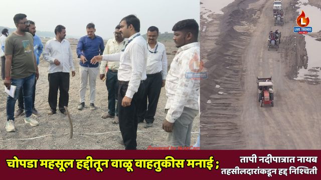 चोपडा-लाईव्ह ट्रेंड्स न्यूज प्रतिनिधी । तापी नदी पात्रातून होत असलेल्या वाळू वाहतुकीबाबत महसूल हद्दींचे उल्लंघन होत असल्याच्या तक्रारी प्राप्त झाल्यानंतर चोपडा तालुक्यात प्रशासनाने तात्काळ कारवाई करत स्पष्ट भूमिका घेतली आहे. अमळनेर तालुक्यातील वाळू वाहतूक करणारी ट्रॅक्टरे चोपडा महसूल हद्दीतून ये-जा करत असल्याची माहिती समोर आल्यानंतर नायब तहसीलदार योगेश पाटील यांनी प्रत्यक्ष तापी नदी पात्रात जाऊन परिस्थितीची पाहणी करत महसूल हद्दीची निश्चिती केली.