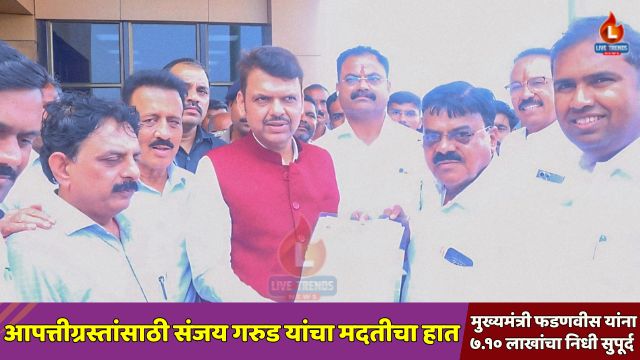 जळगाव – लाईव्ह ट्रेंड्स न्यूज प्रतिनिधी । राज्यात अलीकडेच झालेल्या अतिवृष्टीमुळे निर्माण झालेल्या पूरस्थितीने शेतकरी आणि सर्वसामान्य जनतेच्या जीवनात मोठा गोंधळ उडवून दिला आहे. नैसर्गिक आपत्तीमुळे हजारो हेक्टरवरील पिकांचे नुकसान झाले असून जनजीवन विस्कळीत झाले आहे. या पार्श्वभूमीवर राज्याचे जलसंपदा व आपत्ती व्यवस्थापन मंत्री ना. गिरीश महाजन यांनी समाजातील जबाबदार घटकांना मदतीचे आवाहन केले होते. या आवाहनाला त्वरित प्रतिसाद देत भाजपा नेते व माजी जि.प. सदस्य संजयदादा गरुड यांनी मुख्यमंत्री देवेंद्र फडणवीस यांच्याकडे मुख्यमंत्री सहाय्यता निधीसाठी रु. ७,१०,६६६/- चा धनादेश सुपूर्द केला.