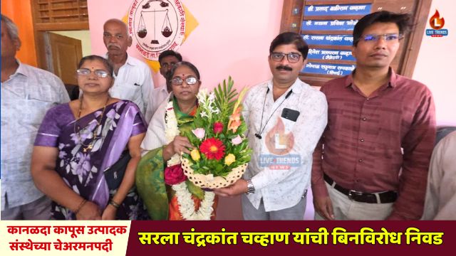 कानळदा (ता. जळगाव) – लाईव्ह ट्रेंड्स न्यूज प्रतिनिधी । जळगाव तालुका कापूस उत्पादक सहकारी संस्था, कानळदा येथे झालेल्या पंचवार्षिक सभेत चेअरमन पदासाठी झालेल्या निवडणुकीत सौ. सरला चंद्रकांत चव्हाण यांची सर्वानुमते बिनविरोध निवड करण्यात आली. संस्थेच्या इतिहासात प्रथमच एका महिलेला चेअरमनपदाची जबाबदारी मिळाल्याने परिसरात आनंदाचे वातावरण आहे.