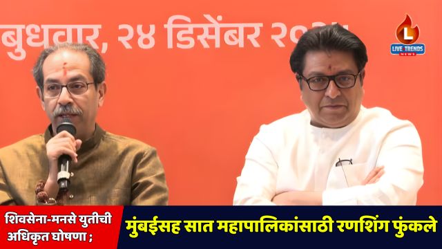 मुंबई-लाईव्ह ट्रेंड्स न्यूज वृत्तसेवा । महाराष्ट्राच्या राजकारणात मोठी घडामोड घडत अखेर शिवसेना ठाकरे गट आणि महाराष्ट्र नवनिर्माण सेनेच्या युतीची अधिकृत घोषणा झाली. गेल्या अनेक दिवसांपासून चर्चेत असलेली ही युती बुधवारी जाहीर झाल्याने राज्यातील राजकीय समीकरणे बदलण्याची शक्यता निर्माण झाली आहे. वरळी येथील ब्ल्यू सी हॉटेलमध्ये झालेल्या संयुक्त पत्रकार परिषदेत राज ठाकरे आणि उद्धव ठाकरे यांनी एकत्र येत निवडणुकीचे रणशिंग फुंकले.