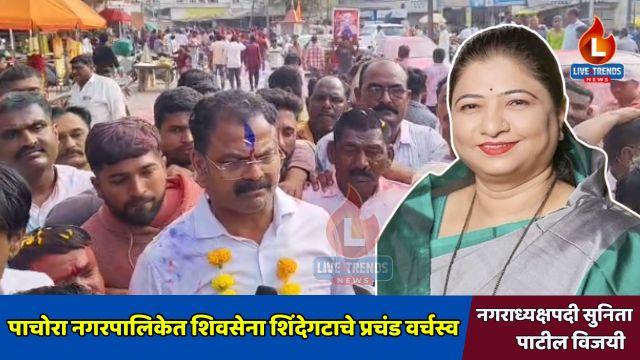 पाचोरा-लाईव्ह ट्रेंड्स न्यूज प्रतिनिधी । पाचोरा नगरपालिकेच्या सार्वत्रिक निवडणुकीत शिवसेना शिंदेगटाने दणदणीत यश मिळवत नगरपालिकेवर आपले प्रचंड वर्चस्व स्थापित केले आहे. नगराध्यक्ष पदासाठी झालेल्या थेट निवडणुकीत शिवसेना शिंदेगटाच्या उमेदवार सुनिता किशोर पाटील यांनी ११,३४८ मतांनी विजय मिळवत शहराच्या राजकारणात आपली छाप सोडली आहे.