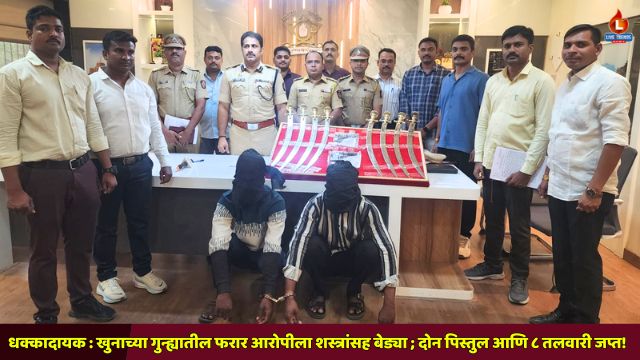 जळगाव लाईव्ह ट्रेंड्स न्यूज प्रतिनिधी | जळगाव शहरात गुन्हेगारी कारवायांना लगाम घालण्यासाठी जळगाव पोलिसांनी मोठी कारवाई केली आहे. खुनाच्या गुन्ह्यातील पाहिजे असलेल्या एका सराईत आरोपीला त्याच्या साथीदारासह जिल्हापेठ पोलिसांनी अत्यंत शिताफीने अटक केली. या कारवाईत पोलिसांनी आरोपींकडून १५ हजार रुपये किमतीची मोटार सायकल, ६० हजार रुपये किमतीची दोन गावठी पिस्तुल आणि ४० हजार रुपये किमतीच्या ८ तलवारी, असा एकूण १ लाख १५ हजार रुपयांचा मुद्देमाल जप्त केला आहे.