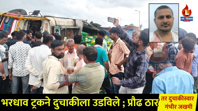 धरणगाव-लाईव्ह ट्रेंडस न्यूज प्रतिनिधी । एरंडोल तालुक्यातील पिंपरी बुद्रुक फाट्यावर गुरुवारी, २१ ऑगस्ट रोजी सायंकाळी ६.३० वाजेच्या सुमारास झालेल्या भीषण अपघातात माळपिंप्री येथील प्रिय रंजन महाराज (वय ४५) यांचा दुर्दैवी मृत्यू झाला. त्यांना घेण्यासाठी आलेल्या प्रवीण नारायण पाटील (वय २७) या दुचाकीस्वारासह ते महामार्ग ओलांडत असताना, समोरून येणाऱ्या भरधाव ट्रकने (एमएच १८, बीए ०१८८) त्यांच्या दुचाकीला जोरदार धडक दिली. या धडकेत महाराज जागीच ठार झाले, तर प्रवीण पाटील यांचे दोन्ही पाय फ्रॅक्चर झाल्याने ते गंभीर जखमी झाले आहेत.