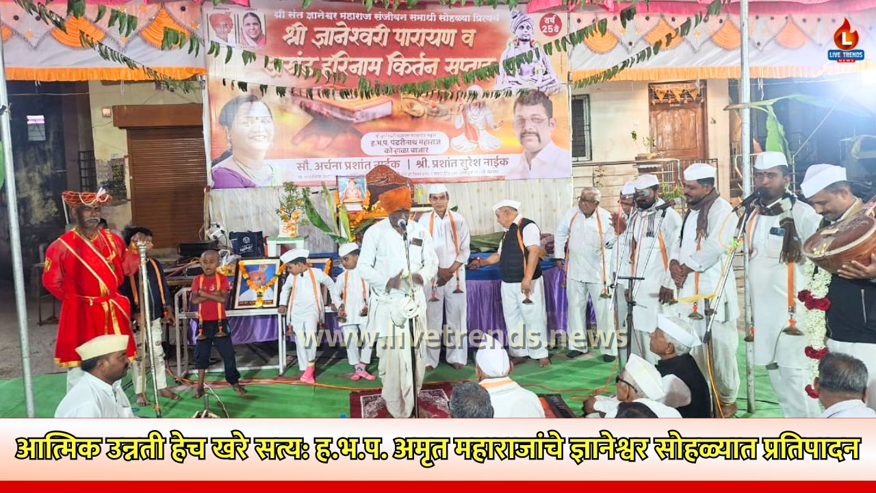 जळगाव लाईव्ह ट्रेंड्स न्यूज प्रतिनिधी | श्री संत ज्ञानेश्वर चौकात सुरू असलेल्या श्री संत ज्ञानेश्वर संजीवन सोहळ्याचा दुसरा दिवस ह.भ.प. अमृत महाराज गाढे बेटावदकर यांच्या सुमधुर किर्तनाने भारून गेला. महाराजांनी ‘परमात्मा सत्य आहे’ या विषयावर अत्यंत सखोल आणि ओजस्वी भाषेत मार्गदर्शन केले.