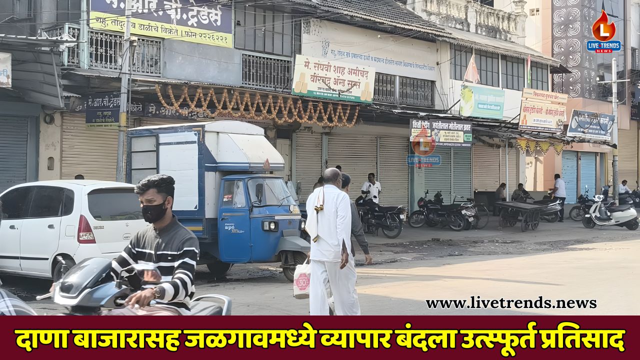 जळगाव-लाईव्ह ट्रेंडस न्यूज प्रतिनिधी । राज्यभरातील व्यापाऱ्यांच्या विविध प्रलंबित मागण्यांकडे सरकारचे होत असलेले दुर्लक्ष आणि अन्यायकारक धोरणांच्या निषेधार्थ शुक्रवार, ५ डिसेंबर रोजी सकाळी ८ वाजेपासून एक दिवसाचा राज्यव्यापी बंद पुकारण्यात आला आहे. या बंदला जळगाव शहरातील व्यापाऱ्यांनी उत्स्फूर्तपणे पाठिंबा देत आपला निषेध नोंदवला. या बंदमध्ये राज्यभरात प्रसिद्ध असलेल्या जळगावच्या दाणा बाजारातील व्यापाऱ्यांनी सक्रिय सहभाग नोंदवला. येथील सर्व व्यापाऱ्यांनी आपली दुकाने पूर्णपणे बंद ठेवली. यामुळे संपूर्ण दाना बाजार परिसरात आज दिवसभर शुकशुकाट पाहायला मिळाला.