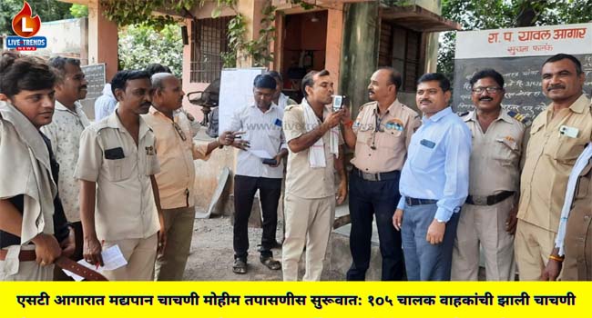 यावल-लाईव्ह ट्रेंड्स न्युज प्रतिनिधी । राज्यातील एसटीच्या विविध तालुक्यातील एकुण २५० आगारातील काम करणाऱ्या शेकडो वाहक आणी चालकांची आता नियमित मद्यपान चाचणीच्या मोहिमेस सुरूवात झाली असुन , यावल जिल्हा जळगाव या आगारात आतापर्यंत सुमारे १०५ चालक आणी वाहकांच्या मद्यपान चाचणीची यंत्रणेव्दारे तपासणी करण्यात आली आहे, माहिती आगार व्यवस्थापक दिलीप महाजन यांनी पत्रकारांना दिली.