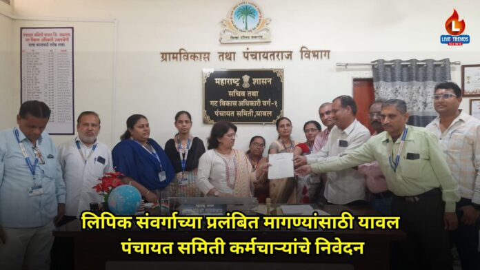 यावल-लाईव्ह ट्रेंड्स न्यूज प्रतिनिधी | यावल येथील पंचायत समिती कर्मचाऱ्यांनी लिपिक संवर्गाच्या विविध प्रलंबित मागण्यांकडे शासनाचे लक्ष वेधण्यासाठी गटविकास अधिकारी डॉ. मंजुश्री गायकवाड यांना निवेदन सादर केले आहे. हे निवेदन जय महाराष्ट्र शासकीय निमशासकीय अधिकारी व कर्मचारी संघटनेच्या वतीने देण्यात आले.