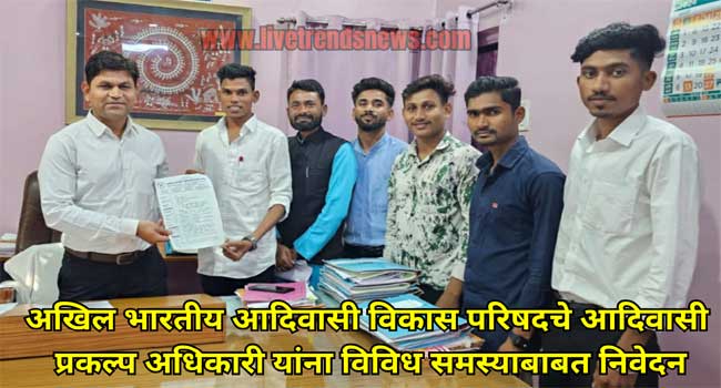 यावल-लाईव्ह ट्रेंडस न्यूज प्रतिनिधी | येथील एकात्मिक आदिवासी विकास प्रकल्प कार्यालय अंतर्गत येणाऱ्या आदिवासी विद्यार्थ्यांच्या विविध समस्या संदर्भात अखिल भारतीय आदिवासी विकास परिषदच्या वतीने संघटनेचे युवा प्रदेश अध्यक्ष अॅड. दारासिंग पावरा यांच्या नेतृत्वाखाली प्रकल्प अधिकारी अरूण पवार यांना देण्यात आले असुन, या मागण्याबाबत आपण त्वरीत लक्ष देऊन समस्या सोडवण्याचा प्रयत्न करणार असल्याचे आश्वासन यावेळी प्रकल्प अधिकारी पवार यांनी दिले.