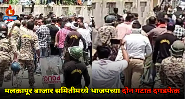 बुलढाण्यातील मलकापूर बाजार समितीमध्ये सभापती विरूद्ध अविश्वास ठराव दाखल करण्यात आला होता. यावेळी भाजपचेच दोन गट एकमेकांसमोर उभे ठाकले होते. अविश्वास ठरावावर चर्चा करण्यासाठी सकाळी अकरा वाजता विशेष बैठक बोलावण्यात आली होती. यावेळी भाजपचेच असलेले संचेती व तायडे गटाचे समर्थक एकमेकांसमोर उभे ठाकले होते. संभाव्य संघर्ष लक्षात घेता बाजार समिती परिसरात तगडा पोलीस बंदोबस्त तैनात करण्यात आला होता. वाहनाना आत येण्यास मनाई होती. यावेळी बाजार समिती परिसराला छावणीचे स्वरूप प्राप्त झाले होते.