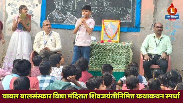 यावल-लाईव्ह ट्रेंड्स न्यूज प्रतिनिधी । यावल येथील बालसंस्कार विद्या मंदिरमध्ये श्रीमंत योगी छत्रपती शिवाजी महाराज जयंतीनिमित्त कथाकथन स्पर्धेचे उत्साहात आयोजन करण्यात आले. विद्यार्थ्यांनी शिवचरित्रातील थरारक आणि प्रेरणादायी प्रसंग प्रभावीपणे सादर करत उपस्थितांची मने जिंकली. संपूर्ण कार्यक्रमात शिवभक्तीचा आणि इतिहासप्रेमाचा उत्साह अनुभवायला मिळाला.