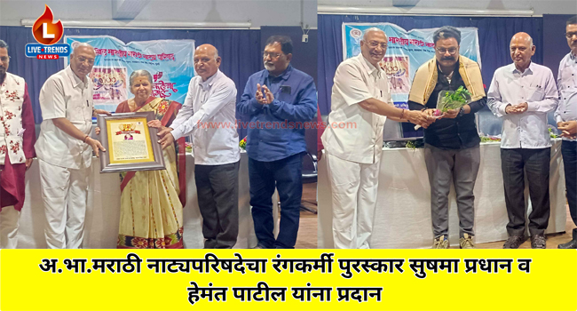 जळगाव-लाईव्ह ट्रेंडस न्यूज प्रतिनिधी । जळगाव जिल्हा शाखेतर्फे दिला जाणारा रंगकर्मी पुरस्कार यंदा ज्येष्ठ रंगकर्मी सुषमा प्रधान यांना तर युवा रंगकर्मी पुरस्कार हास्यजत्राफेम अभिनेते हेमंत पाटील यांना प्रदान करण्यात आला.