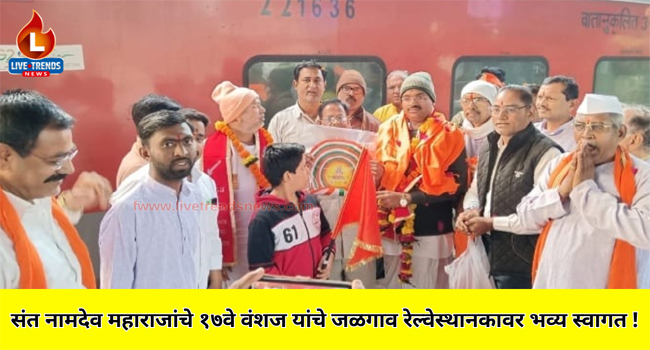 जळगाव-लाईव्ह ट्रेंडस न्यूज प्रतिनिधी । राम मंदिर ते राष्ट्र मंदिर संपूर्ण विश्वाचे व करोडो राम भक्तांचे श्रद्धास्थान असलेले प्रभू श्रीराम मंदिराचा प्राणप्रतिष्ठा सोहळा २२ जानेवारी रोजी संपन्न होणार असून या सोहळ्यासाठी जळगाव १९ जानेवारी रोजी जळगाव रेल्वे स्थानकावरून कृषीनगर एक्सप्रेसने अयोध्येला जात असतांना संत नामदेव महाराजांचे १७ वंशज हभप निवृत्ती व मुरारी नामदास महाराज व १० वारकरी बांधवांचे प्रभु श्रीराम च्या जयघोषात स्वागत करण्यात आले.