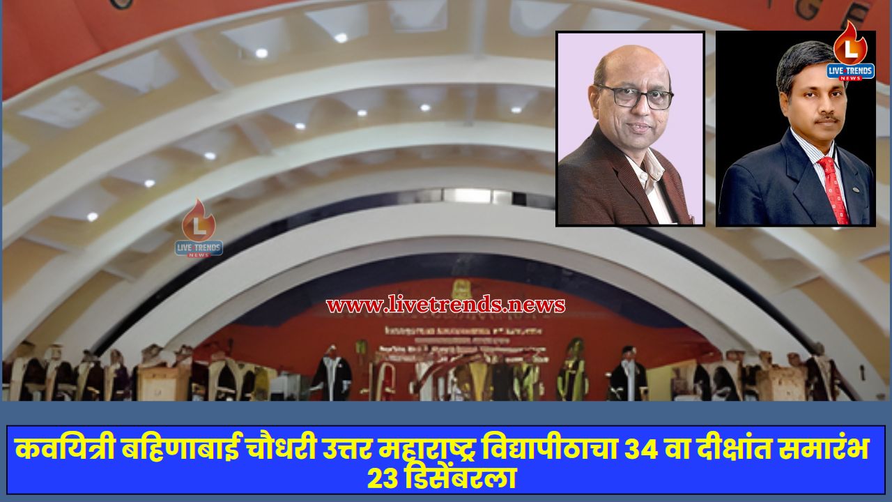 जळगाव–लाईव्ह ट्रेंड्स न्यूज प्रतिनिधी । कवयित्री बहिणाबाई चौधरी उत्तर महाराष्ट्र विद्यापीठाचा ३४ वा दीक्षांत समारंभ मंगळवार, दि. २३ डिसेंबर २०२५ रोजी सकाळी १० वाजता विद्यापीठाच्या दीक्षांत सभागृहात उत्साहात संपन्न होणार असून, या समारंभासाठीची सर्व तयारी पूर्ण झाल्याची माहिती विद्यापीठ प्रशासनाने दिली आहे. हजारो विद्यार्थ्यांच्या शैक्षणिक प्रवासातील हा महत्त्वाचा टप्पा ठरणार असून, विद्यापीठ परिसरात समारंभपूर्व उत्साहाचे वातावरण आहे.