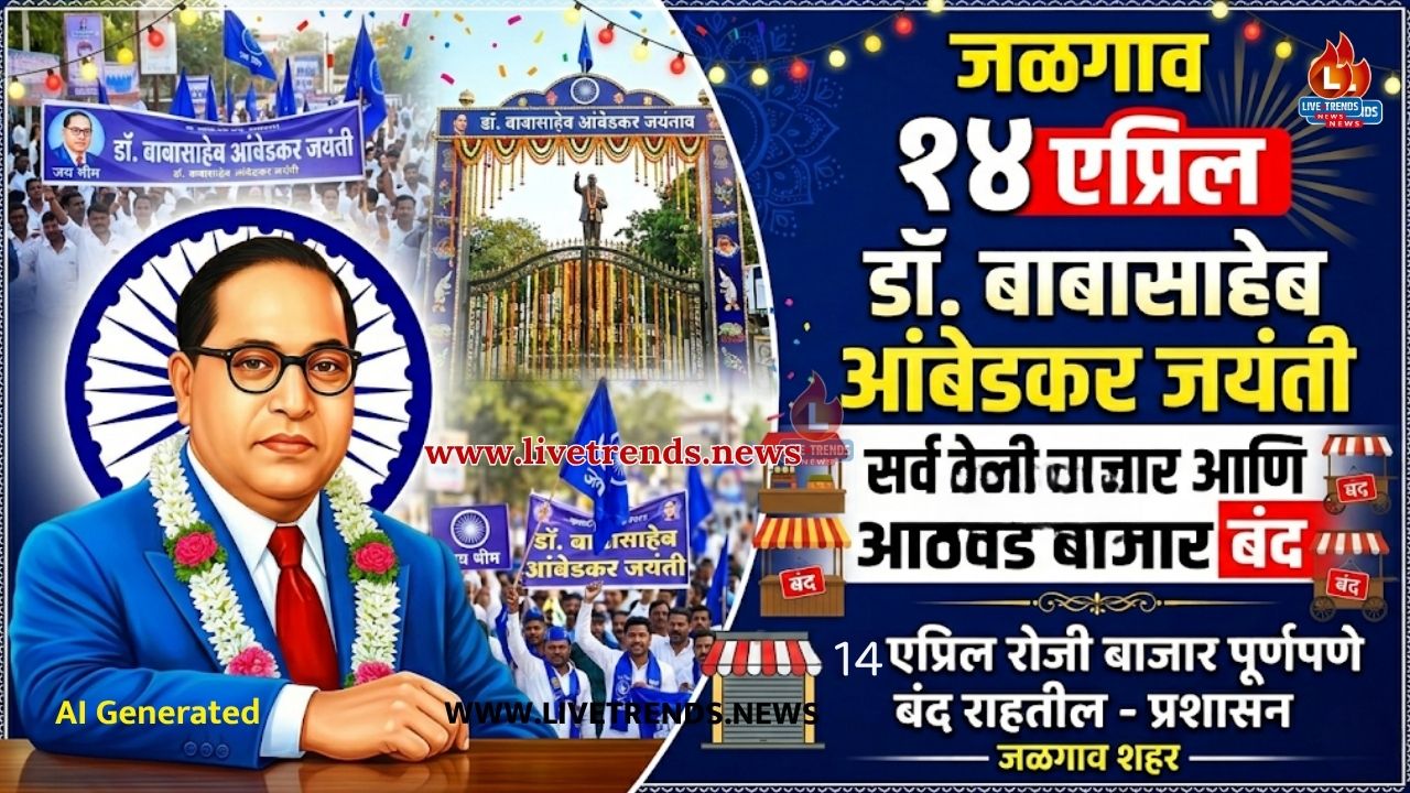 जळगाव-लाईव्ह ट्रेंडस न्यूज प्रतिनिधी । भारतरत्न डॉ. बाबासाहेब आंबेडकर यांच्या जयंतीनिमित्त मंगळवारी, १४ एप्रिल २०२६ रोजी जळगाव शहरात निघणाऱ्या भव्य मिरवणुकांच्या पार्श्वभूमीवर महानगरपालिका प्रशासनाने महत्त्वाचे निर्बंध लागू केले आहेत. शहरातील कायदा व सुव्यवस्था राखण्यासाठी आणि वाहतुकीची कोंडी टाळण्यासाठी या दिवशी शहरातील प्रमुख रस्त्यांवरील डेली बाजार तसेच हरी विठ्ठल नगर आणि खंडेराव नगर परिसरातील साप्ताहिक आठवडे बाजार पूर्णपणे बंद ठेवण्याचे आदेश उपायुक्त पंकज गोसावी यांनी दिले आहेत.