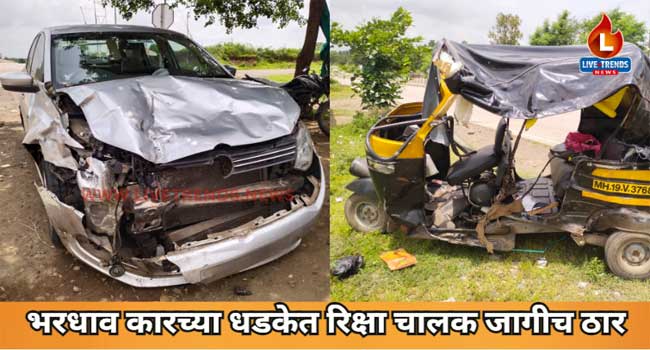 एमआयडीसी पोलीस सुत्रांनी दिलेली माहिती अशी की, जळगाव तालुक्यातील उमाळा गावातील बसस्थानकाजवळ बुधवारी १६ ऑगस्ट रोजी दुपारी १२ वाजेच्या सुमारास रिक्षा क्रमांक (एमएच १९ व्ही ३७६८) या प्रवाशी रिक्षाला भरधाव वेगाने येणारी कार क्रमांक (एमएच ०२ बीआर ४३९१) ने जोरदार धडक दिली. या धडकेत रिक्षा चालक राजू ओमप्रकाश साहू (वय ४५) यांचा दुर्दैवी मृत्यू झाला आहे. तर रिक्षात असलेले प्रवासी जखमी झाले. जखमींना तातडीने जिल्हा शासकीय वैद्यकीय महाविद्यालयात दाखल करण्यात आले. या अपघातात रिक्षासह कारचे मोठे नुकसान झाले आहे. याप्रकरणी हरीज्ञ मोहन साहू (वय-३०) रा. वाघ नगर, जळगाव यांनी दिलेल्या फिर्यादीवरून कारवरील अज्ञात चालकाविरोधात एमआयडीसी पोलीस ठाण्यात गुन्हा दाखल करण्यात आला आहे. पुढील तपास पोलीस उपनिरीक्षक अनिस शेख करीत आहे.
