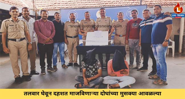 चाळीसगाव शहरातील शास्त्री नगरात १ ऑगस्ट रोजी मध्यरात्री १ वाजेच्या सुमारास दोन संशयित हातात तलवार घेवून परिसरात दहशत माजवित असल्याची गोपनिय माहिती चाळीसगाव शहर पोलीस ठाण्याचे कर्मचारी पोकॉ गणेश कुवर, अमोल भोसले यांना मिळाली. त्यांनी तात्काळ पोलीस निरीक्षक संदीप पाटील यांना ही माहिती दिली. त्यानुसार पोलीस ठाण्याचे पोलीस कर्मचारी यांनी तात्काळ कारवाई करत संशयित आरोपी मंजितसिंग दिलीपसिंग बावरी, वय 19 वर्षे रा. दिलीपसिंग बावरी, शैंदला, मेहकर बुलढाणा ह.मु बस स्टँण्डच्या पाठीमागे, चाळीसगाव आणि किरण सखाराम गवळी वय 22 वर्षे रा. लक्ष्मीनगर, संतोषीमाता मंदीरामागे, चाळीसगाव यांना ताब्यात घेतले. त्यांच्याकडून दुचाकी आणि तलवार हस्तगत केली आहे. दोघांवर चाळीसगाव शहर पोलीस ठाण्यात गुन्हा दाखल करण्यात आला आहे.