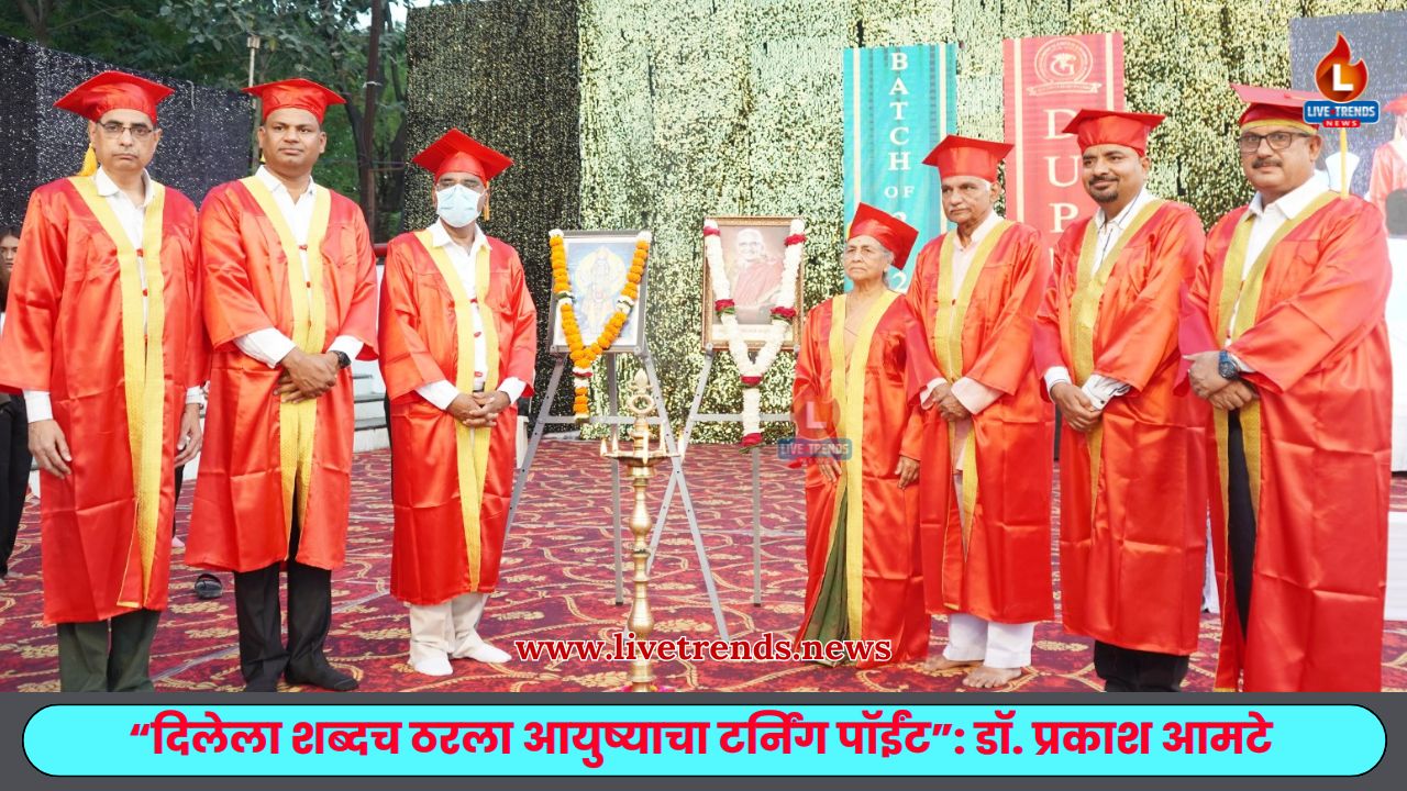 जळगाव-लाईव्ह ट्रेंड्स न्यूज प्रतिनिधी । “माझ्या वडिलांनी वैद्यकीय पदवी घेतल्यानंतर त्यांचे कार्य पुढे सुरू ठेवशील का, असा प्रश्न विचारला आणि मी ‘हो’ म्हणून दिलेला शब्दच माझ्या आयुष्यातला खरा टर्निंग पॉईंट ठरला,” असे भावनिक प्रतिपादन पद्मश्री डॉ. प्रकाश आमटे यांनी येथे केले. डॉ. उल्हास पाटील वैद्यकीय महाविद्यालय येथे सन २०२० बॅचचा दीक्षांत समारंभ मोठ्या उत्साहात पार पडला, त्यावेळी ते प्रमुख पाहुणे म्हणून बोलत होते.