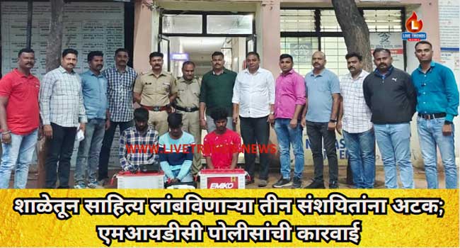 जळगाव-लाईव्ह ट्रेंडस न्यूज प्रतिनिधी । जळगाव तालुक्यातील शिरसोली गावातील पद्मालय इंग्लिश मिडीयम स्कूल मधून इलेक्ट्रीक मोटार, सीसीटीव्ही कॅमेरे आणि इतर साहित्य चोरी केल्याची घटना घडली होती. एमआयडीसी पोलीस ठाण्यात दाखल गुन्ह्यातील तीन संशयित आरोपींना शिरसोली गावातून मंगळवारी १ ऑगस्ट रोजी रात्री ११ वाजता अटक करण्यात एमआयडीसी पोलीसांना यश आले आहे. संशयितांकडून चोरीला गेलेला मुद्देमाल हस्तगत करण्यात आला आहे.