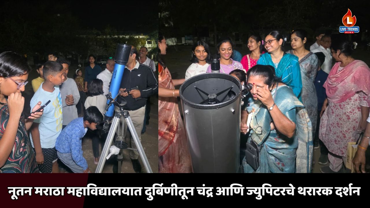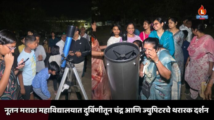 जळगाव-लाईव्ह ट्रेंड्स न्यूज प्रतिनिधी । विज्ञानाची आवड आणि खगोलशास्त्राबद्दलची जिज्ञासा वृद्धिंगत करण्याच्या उद्देशाने शहरातील नूतन मराठा महाविद्यालय आणि स्वर्गीय दादासाहेब देवराम खुशाल पाटील फाउंडेशन यांच्या संयुक्त विद्यमाने राष्ट्रीय विज्ञान दिनाच्या पूर्वसंध्येला भव्य आकाश निरीक्षण कार्यक्रमाचे आयोजन करण्यात आले. या उपक्रमामुळे विद्यार्थ्यांना चंद्र आणि ज्युपिटरचे प्रत्यक्ष दुर्बिणीतून दर्शन घेण्याची दुर्मीळ संधी मिळाली.