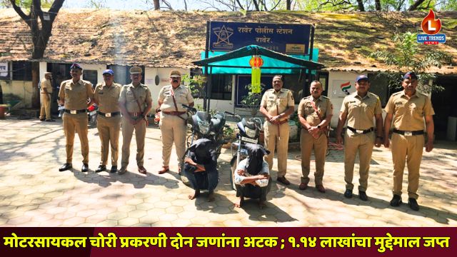रावेर लाईव्ह ट्रेंड्स न्यूज प्रतिनिधी | रावेर पोलीस स्टेशनच्या हद्दीत राबवण्यात आलेल्या विशेष ‘कोंबिंग ऑपरेशन’ आणि नाकाबंदी दरम्यान पोलिसांनी दोन अट्टल दुचाकी चोरांना अटक करण्यात यश मिळवले आहे. त्यांच्याकडून चोरीच्या दोन मोटारसायकल जप्त करण्यात आल्या असून, शहरात अवैध धंदे करणाऱ्यांवरही मोठी कारवाई करण्यात आली आहे.