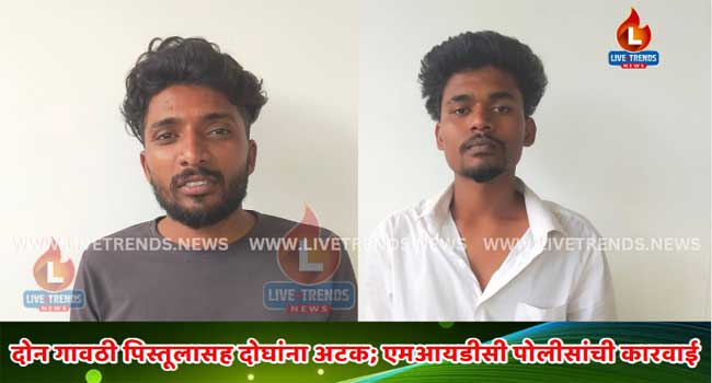 जळगाव-लाईव्ह ट्रेंडस न्यूज प्रतिनिधी । जळगाव शहरातील मेहरून मधील जे.के. पार्क येथे हातात गावठी पिस्तूल घेऊन फिरणाऱ्या दोन जणांना एमआयडीसी पोलिसांनी गुरुवार २९ फेब्रुवारी रोजी रात्री कारवाई करत अटक केली आहे. त्यांच्याकडून दोन गावठी पिस्तूल आणि दुचाकी हस्तगत केली आहे. याप्रकरणी एमआयडीसी पोलीस ठाण्यात दोन जणांविरोधात गुन्हा दाखल करण्यात आला आहे. अमन रशीद सय्यद उर्फ खेकडा वय-२१, रा. सुप्रीम कॉलनी आणि दीपक लक्ष्मण तरटे वय-२६, रा.रामेश्वर कॉलनी असे अटक केलेल्या संशयित आरोपींची नावे आहेत.