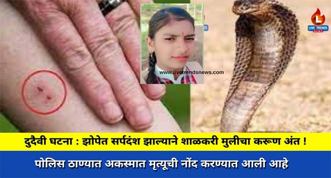 सांगली-लाईव्ह ट्रेंडस न्यूज प्रतिनिधी । रात्री झोपेत असतांना सर्पदंश झाल्याने १५ वर्षीय शाळकरी मुलीचा करूण अंत झाल्याची दुदैवी घटना समोर आली आहे. श्रेया श्रीशैली न्हावी (वय-१५) रा. संख ता. जत जि.सांगली. असे मयत शाळकरी मुलीचे नाव आहे. नातेवाईकांनी तातडीने जत ग्रामीण रूग्णालयात दाखल केले असता वैद्यकीय अधिकारी यांनी मयत घोषीत केले.