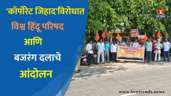 जळगाव-लाईव्ह ट्रेंड्स न्यूज प्रतिनिधी । शहरात विश्व हिंदू परिषद आणि बजरंग दलाच्या वतीने ‘कॉर्पोरेट जिहाद’ विरोधात आंदोलन करण्यात आले असून या माध्यमातून केंद्र सरकारकडे कठोर कारवाईची मागणी करण्यात आली आहे. आज बुधवार, २२ एप्रिल रोजी जिल्हाधिकारी कार्यालयासमोर झालेल्या या आंदोलनात कार्यकर्त्यांनी विविध मुद्द्यांवर आवाज उठवत राष्ट्रपतींना निवेदन सादर केले.