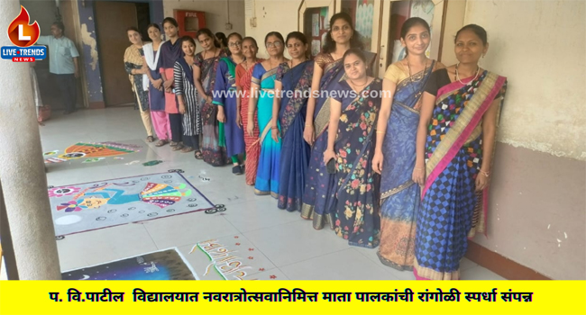जळगाव-लाईव्ह ट्रेंडस न्यूज प्रतिनिधी । के.सी.ई.सोसायटी संचालित गुरुवर्य परशुराम विठोबा पाटील प्राथमिक विद्यामंदीर येथे माता पालकांसाठी नवरात्रोत्सवानिमित्त रांगोळी स्पर्धेचे आयोजन करण्यात आले.
