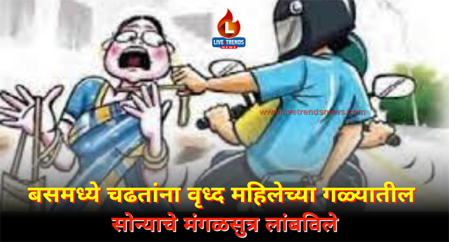 चोपडा-लाईव्ह ट्रेंडस न्यूज प्रतिनिधी । चोपडा बसस्थानक आवारात बसमध्ये चढत असतांना वृध्द महिलेच्या गळ्यातील ५७ हजार रूपये किंमतीचे सोन्याचे मंगळसुत्र अज्ञात चोरट्यांनी चोरून नेल्याची घटना समोर आली आहे. याप्रकरणी चोपडा शहर पोलीस ठाण्यात अज्ञात चोरट्यांविरोधात गुन्हा दाखल करण्यात आला आहे.