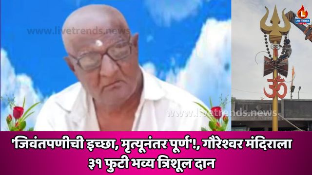अमळनेर-लाईव्ह ट्रेंडस न्यूज प्रतिनिधी । अमळनेर तालुक्यातील शहापूर येथील गौरेश्वर महादेव मंदिरावर ३१ फुटांचा भव्य त्रिशूल दान करून कै. पिरन भोमा पाटील यांनी आपल्या मृत्यूनंतर आयुष्यभर कमावलेल्या पैशांचे अनोखे आणि प्रेरणादायी दान केले आहे. जिवंतपणी बोलून दाखवलेली इच्छा मृत्यूनंतर पूर्णत्वास नेण्याच्या या आगळ्यावेगळ्या दातृत्वाची चर्चा संपूर्ण पंचक्रोशीत सुरू आहे.