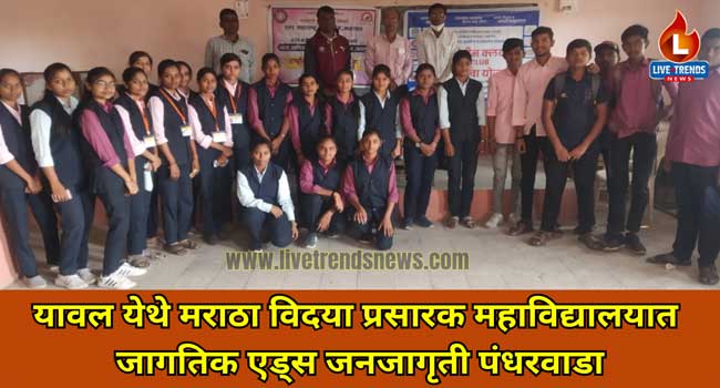 यावल-लाईव्ह ट्रेंडस न्यूज प्रतिनिधी | यावल येथील जळगाव जिल्हा मराठा विद्या प्रसारक सहकारी समाज संचलित कला, वाणिज्य व विज्ञान महाविद्यालयात राष्ट्रीय सेवा योजना विभाग, रेड रिबन क्लब व ग्रामीण रुग्णालय यावल यांच्या संयुक्त विद्यमाने जागतिक एड्स जनजागृती पंधरवाडा निमित्ताने विद्यार्थ्यांमध्ये जनजागृती करण्यासाठी महाविद्यालयात विविध कार्यक्रमांचे आयोजन प्राचार्या डॉ. संध्या सोनवणे यांच्या मार्गदर्शनाखाली करण्यात आले.