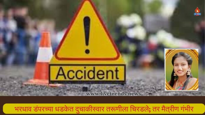 चाळीसगाव लाईव्ह ट्रेंडस न्यूज प्रतिनिधी । भरधाव वेगाने जाणाऱ्या डंपरने दुचाकीला पाठीमागून जोराची धडक दिल्याने झालेल्या भीषण अपघातात एका २० वर्षीय तरुणीचा जागीच मृत्यू झाला, तर तिची मैत्रीण गंभीर जखमी झाली आहे. ही घटना चाळीसगाव-धुळे रोडवरील दसेगाव फाट्याजवळ बुधवारी २ एप्रिल दुपारी साडेअकराच्या सुमारास घडली. याबाबत मेहुणबारे पोलीस ठाण्यात गुन्हा दाखल करण्यात आला असून डंपरचालकाला अटक करण्यात आली आहे.
